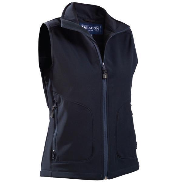 Ladies’ wind and water repellent, “Softshell” vest. Two side pockets with zips. Tailored fit. Drawstring at hem.